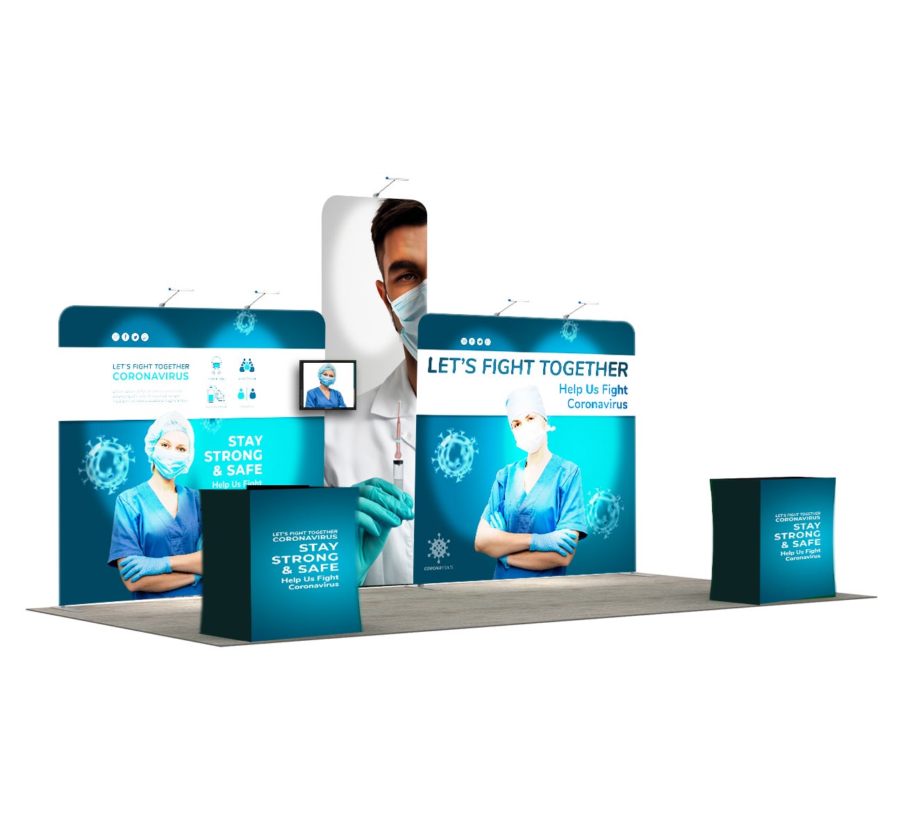 - Fabric Wall Display 2 - Qty 1: Sized at 39.5''W x 127.8''H, this Professional 20 Ft Exhibit Booth for Corporate Events is fitted with aluminium hardware, polyester fabric, a graphic GSM of 210G, dye-sublimation printing, and a pole diameter and thickness of 32mm and 1.1mm, respectively. It offers single or double-sided printing options.