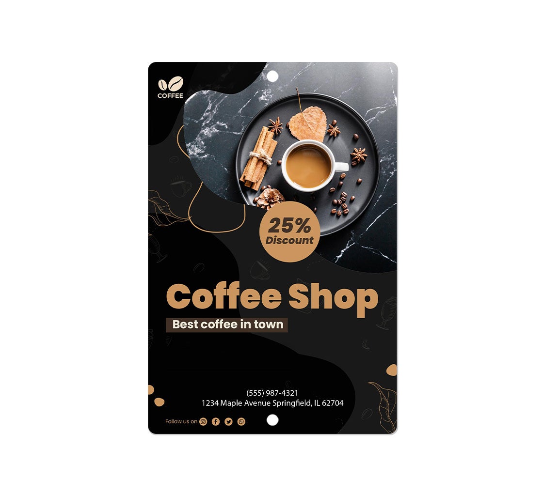 Make your mark with our custom coffee shop signs, available in both standard and bespoke dimensions. Select your preferred mounting style with options for clean edges, top-bottom holes, side holes, or corner fixings. We offer three straightforward design pathways: Design Online with our intuitive tool that puts creative control at your disposal, Upload Your Artwork to realise your unique vision, or collaborate with our professional designers who understand the art of impactful signage. Every sign is crafted to your specifications, ensuring you receive precisely what your space requires.