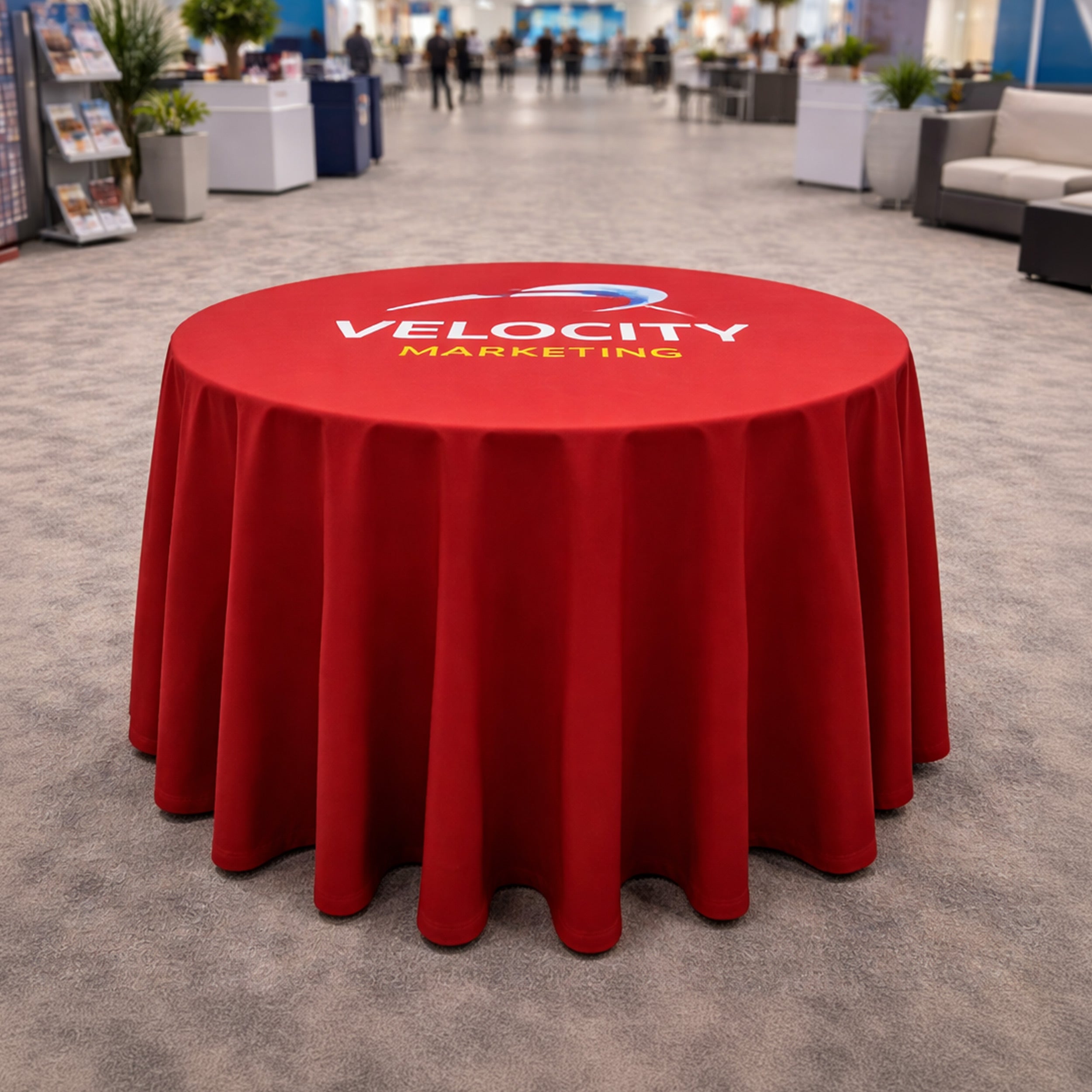 Round table throws are made to sit neatly over the tabletop, covering the whole table. They make your logo or message clearly visible. From exhibitions to product launches and local community events, they help your stand look organised.