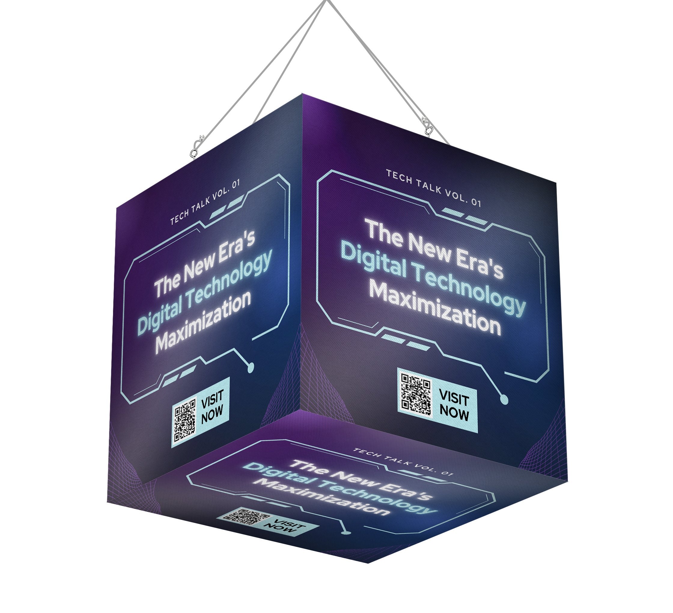 Our custom hanging banners offer extensive customization options through our easy-to-use online platform. Modify everything from the color to the placement of your logo to ensure your brand is accurately represented. The cube banners are simple to install, with several hanging mechanisms included, allowing for quick and efficient setup.